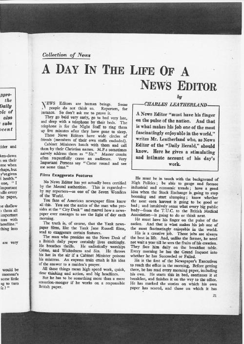 In 1947 Leatherland wrote about his experiences as News Editor for the Inky Way Annual, a book about working in Fleet Street. The article provides an interesting and entertaining insight into a typical day in the life of a news editor on a daily newspaper :
